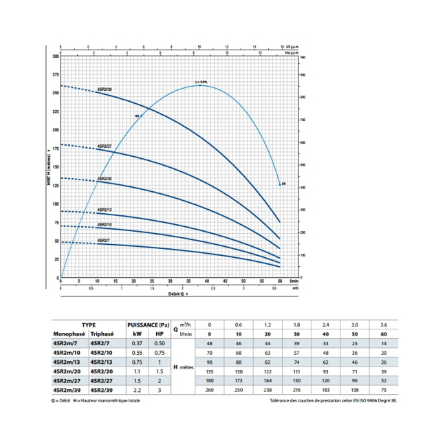 | HMT (Hauteur manométrique) | 14 à 46 m,20 à 68 m,26 à 88 m,39 à 130 m,52 à 173 m,75 à 250 m |
