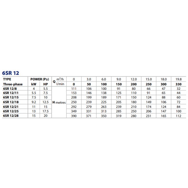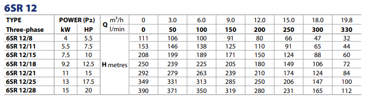 Pompes immergées 6SR12 Tri pour forages 6'' ou plus. Idéales pour de nombreuses applications (alimentation, surpression et distribution d'eau dans des installations agricoles et industrielles).
