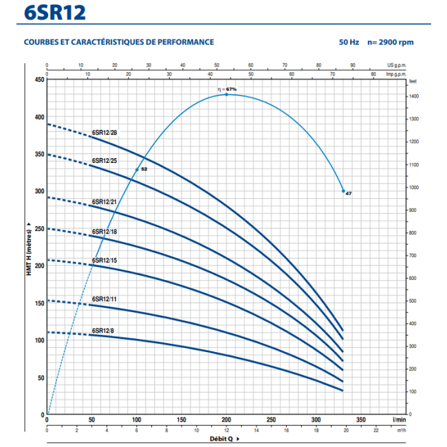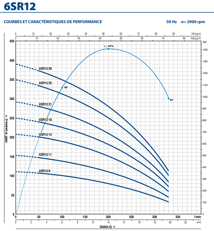 Débit : 3 à 19.8 m3/h - Hmt : 32 à 371 m - Puissance : 4 à 15 Kw - Tri