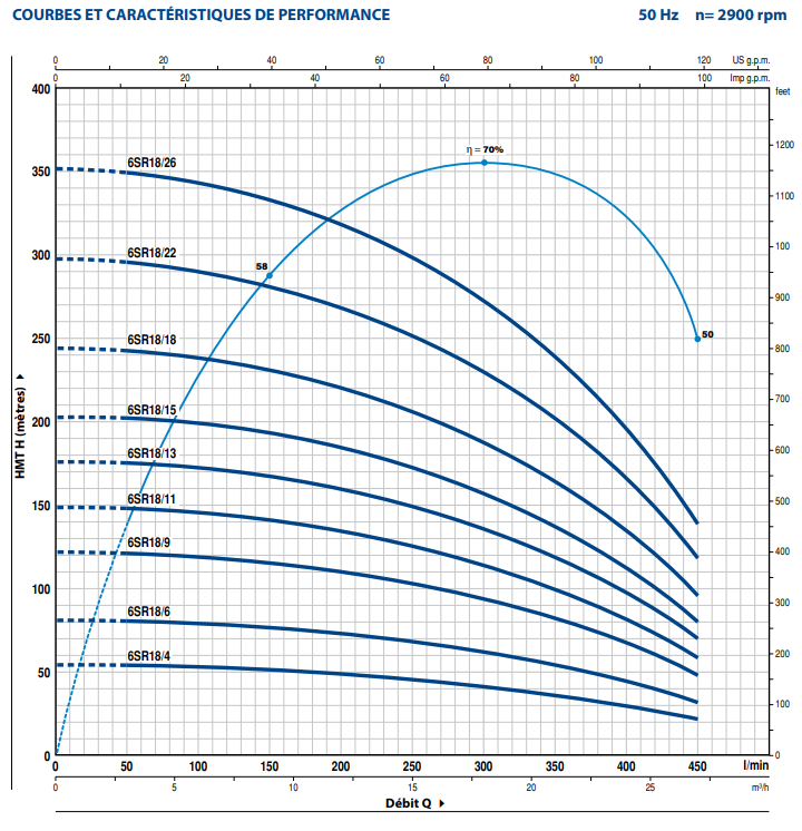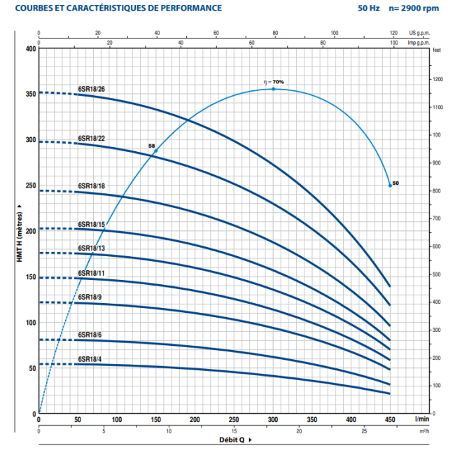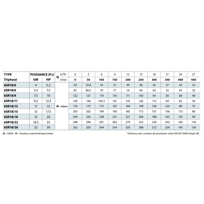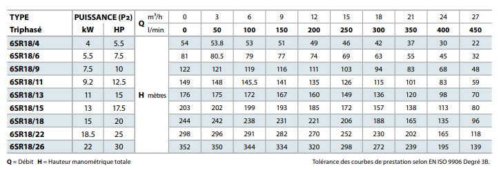 Débit : 3 à 27 m3/h - Hmt : 22 à 350 m - Puissance : 4 à 22 Kw - Tri