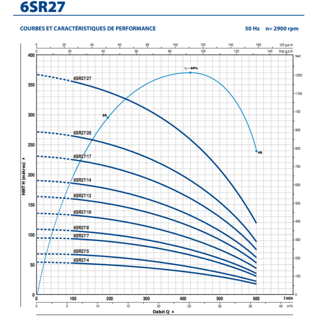 Débit : 3 à 27 m3/h - Hmt : 18 à 356 m - Puissance : 4 à 30 Kw - Tri