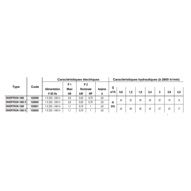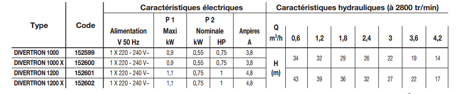| Type de pompe immergée | Divertron (0,5 à 4,5 m3/h) |