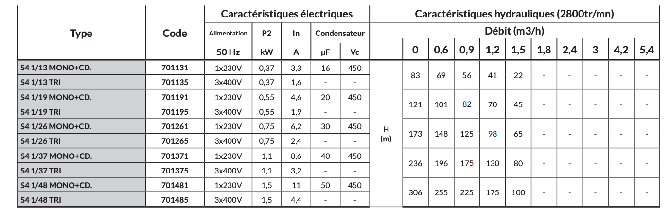 - Débit : 0,6 à 1,5 m3/h - Hmt : 13,7 à 278 m - Puissance : 0.37 à 1,5 Kw tri