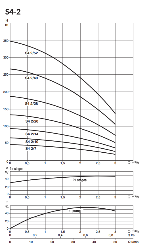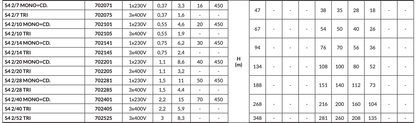- Débit : 1,5 à 3 m3/h - Hmt : 47 à 268 m - Puissance : 0,37 à 2,2 Kw Mono