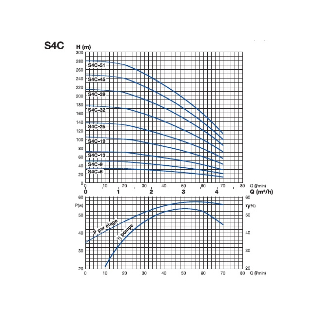 - Débit : 1,2 à 4,2 m3/h - Hmt : 13 à 270 m - Puissance : 0,37 à 3 Kw Tri