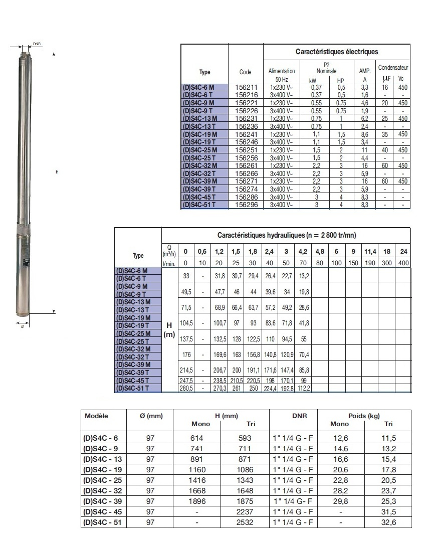 | Type de pompe immergée | S4C (1,2 à 1,8 m3/h) |