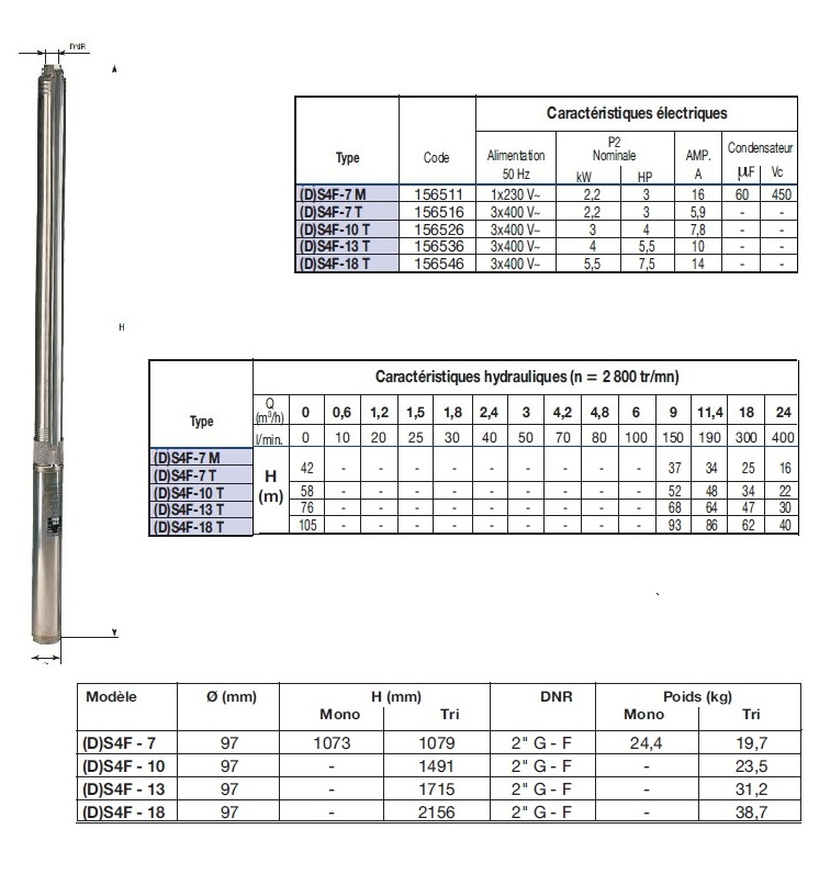 | Type de pompe immergée | S4F (9 à 24 m3/h) |