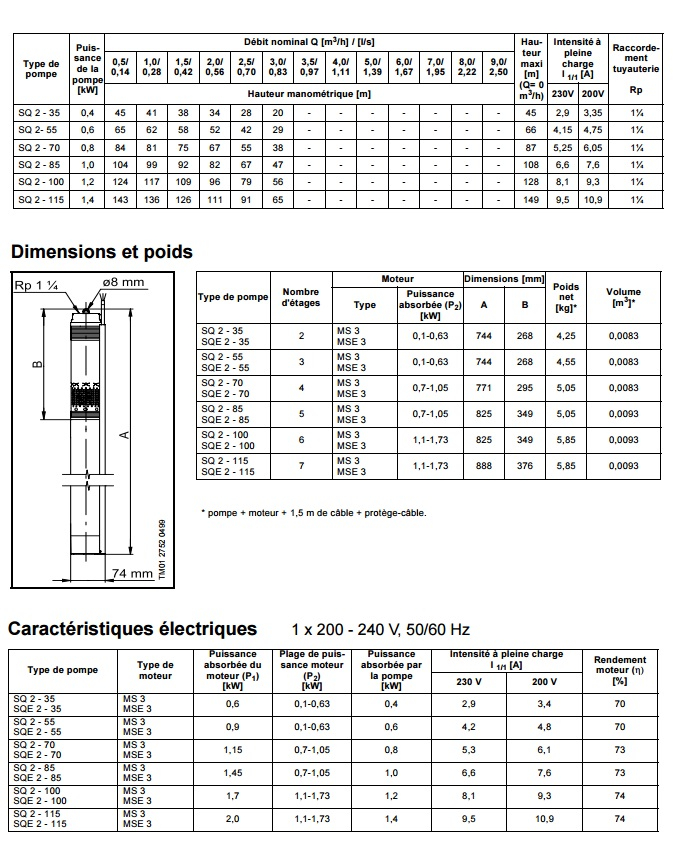 | Caractéristiques | Pompe immergée 3" centrifuge multicellulaire. |