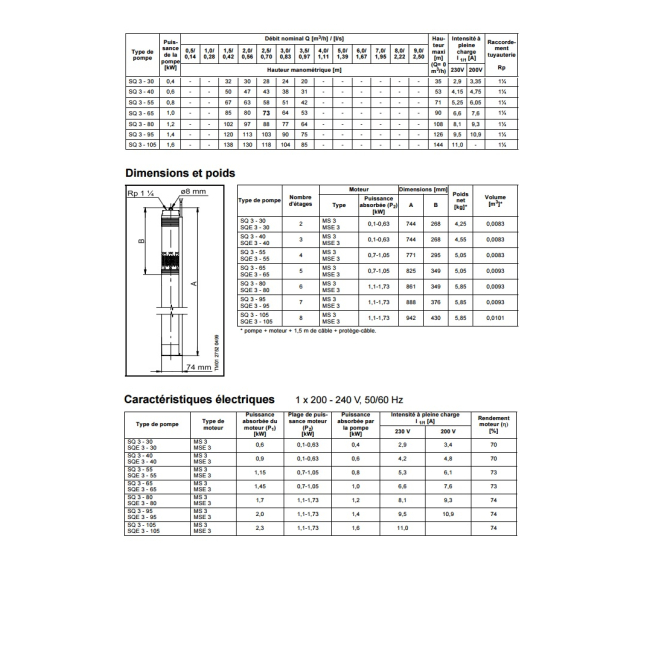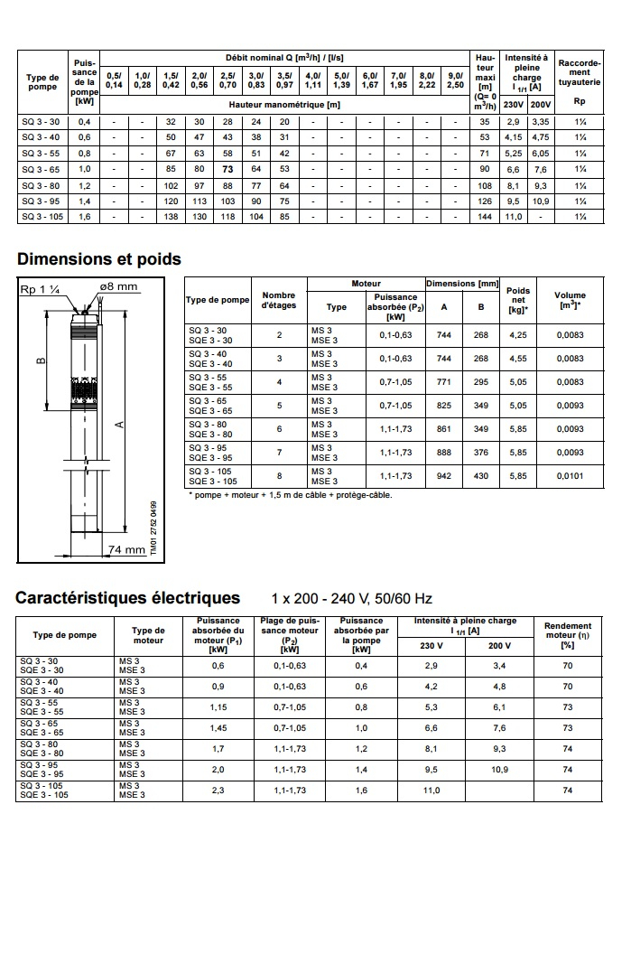 | Caractéristiques | Pompe immergée 3" centrifuge multicellulaire. |
