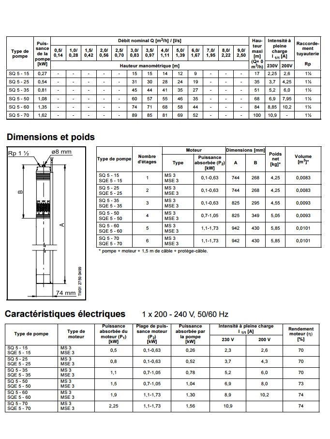 | Caractéristiques | Pompe immergée 3" centrifuge multicellulaire. |