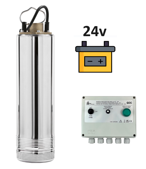 Pompe immergée 5" SR 24V est conçue pour les puits et citernes. Son moteur en courant continu garantit une performance fiable et une utilisation efficace de l'eau.