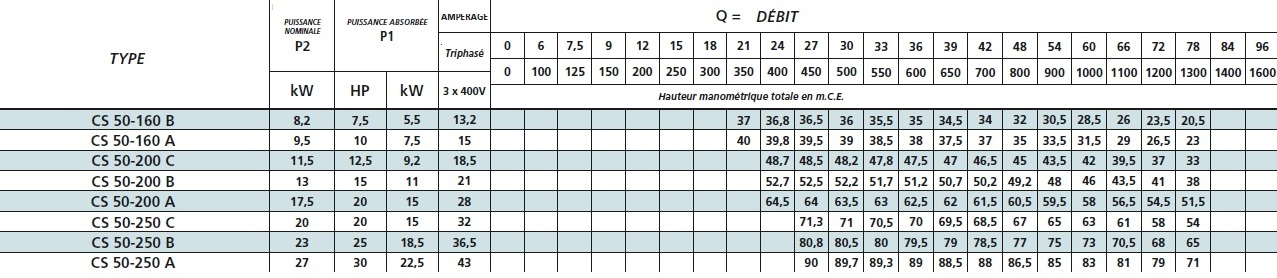 | Type de pompe de surface | CS 50 (30 à 72 m3/h) |