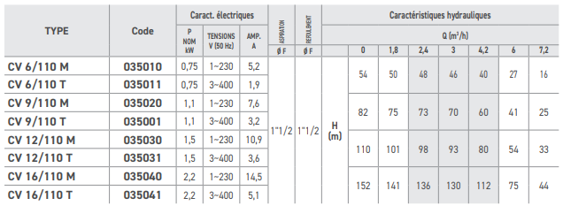 Les modèles de la série CV 110 sont disponibles en plusieurs configurations, y compris les versions monophasées (M) et triphasées (T) pour s'adapter à vos besoins spécifiques en termes de puissance et de raccordement électrique. Chaque pompe est testée en usine et offre une pression maximale de service de 16 bars (1600 KPa).