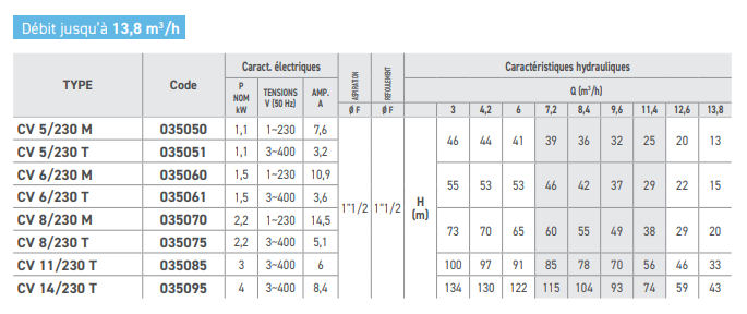 Débit : 3 à 13,8 m3/h - HMT : jusqu'à 134 m - Puissance : 1,1 à 4 kW - TRI