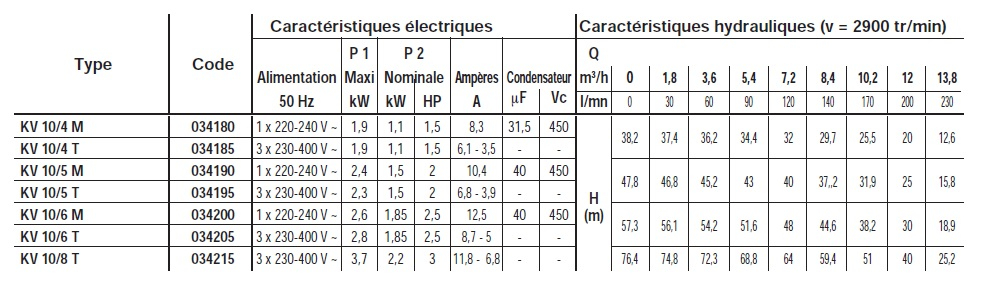 | Type de pompe de surface | KV 10 (3,6 à 13,8 m3/h) |