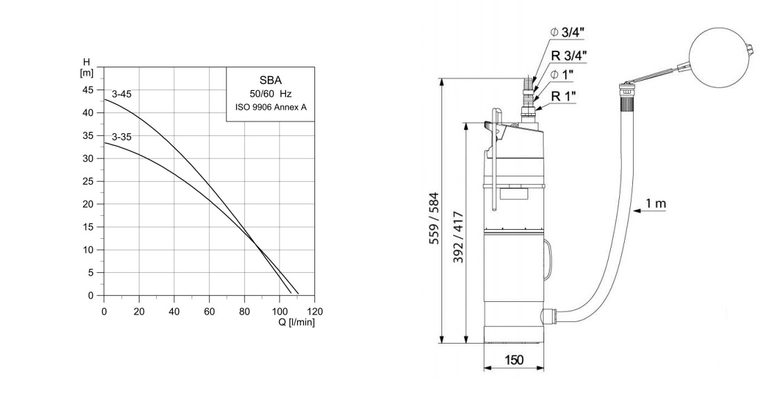 | Type de pompe immergée | SBA (2,4 à 6,6 m3/h) |