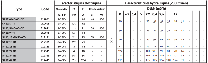 - Débit : 7.2 à 13 m3/h - Hmt : 11 à 55 m - Puissance : 1.1 à 2.2 Kw Mono