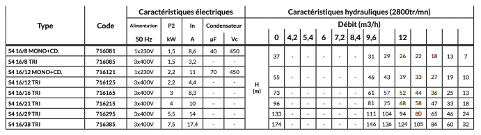 - Débit : 9.6 à 19 m3/h - Hmt : 7 à 46 m - Puissance : 1.5 à 2.2 Kw Mono