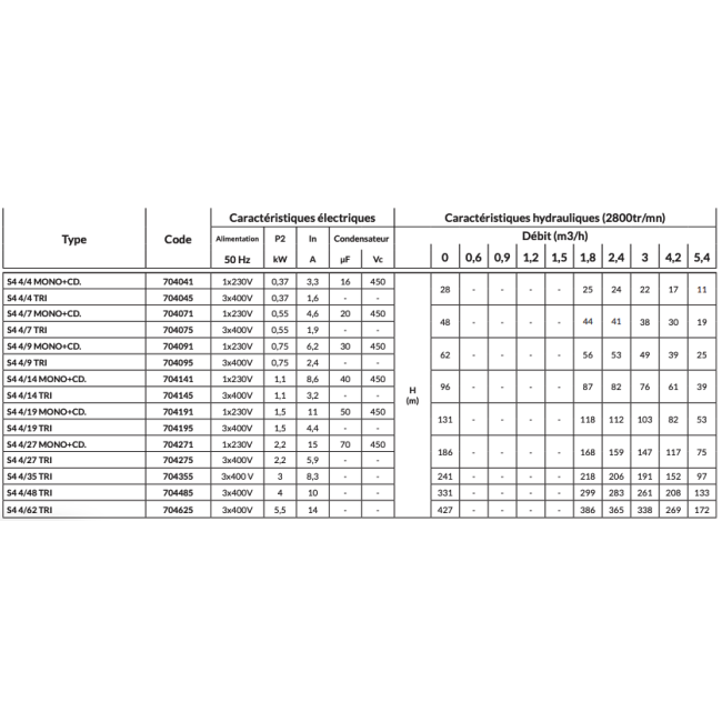- Débit : 1.8 à 5.4 m3/h - Hmt : 11 à 168 m - Puissance : 0.37 à 2.2 Kw Mono