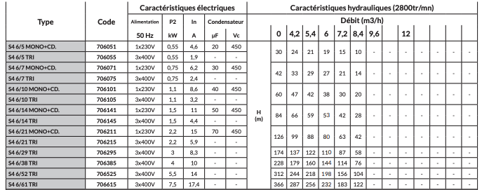 - Débit : 0 à 8.4 m3/h - Hmt : 10 à 126 m - Puissance : 0.55 à 2.2 Kw Mono