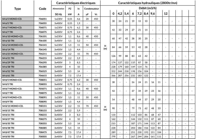 - Débit : 6 à 11 m3/h - Hmt : 11 à 79 m - Puissance : 0.75 à 2.2 Kw Mono