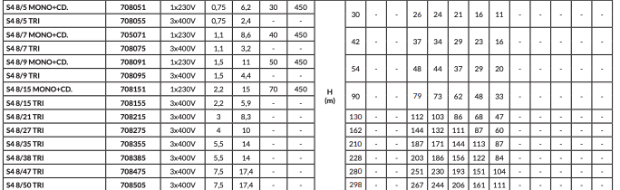 - Pompes immergées pour forage 4" ou plus, offrant un vaste choix de débits et de pressions pour répondre à de nombreuses applications dans l'alimention, la surpression et la distribution d'eau dans des installations domestiques et industrielles (incendie, lavage, irrigation).