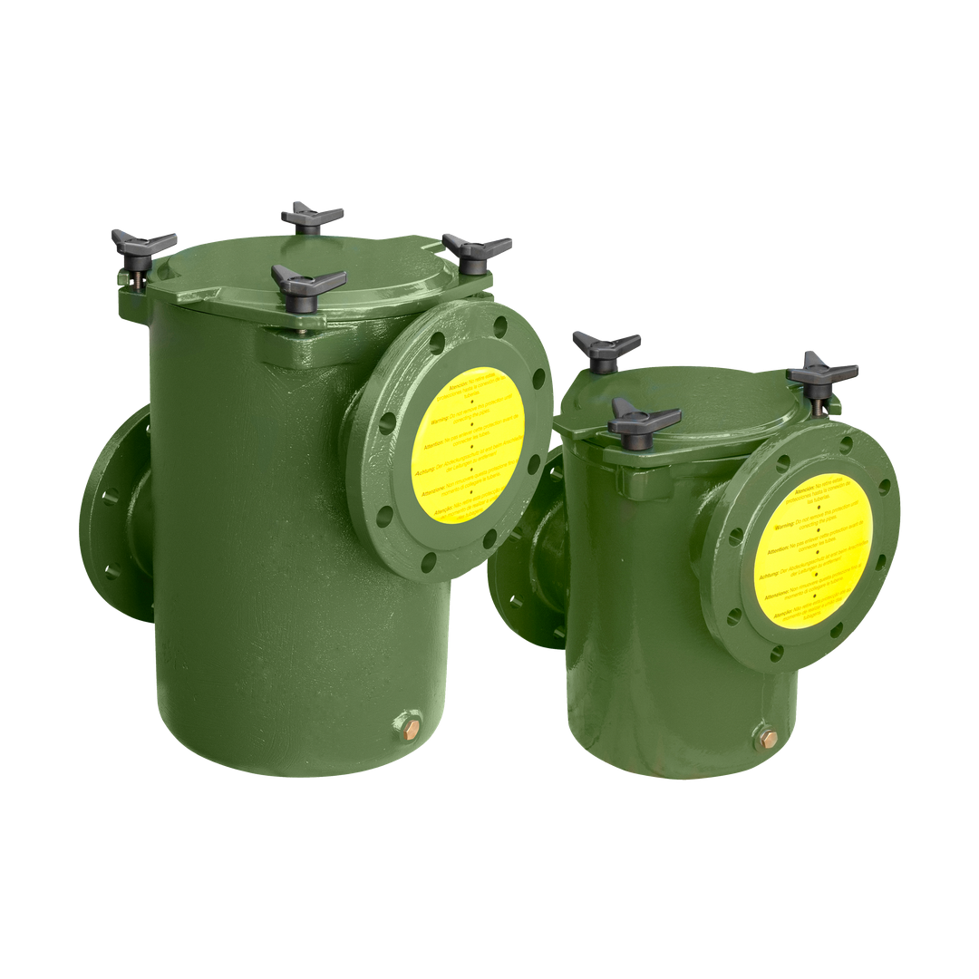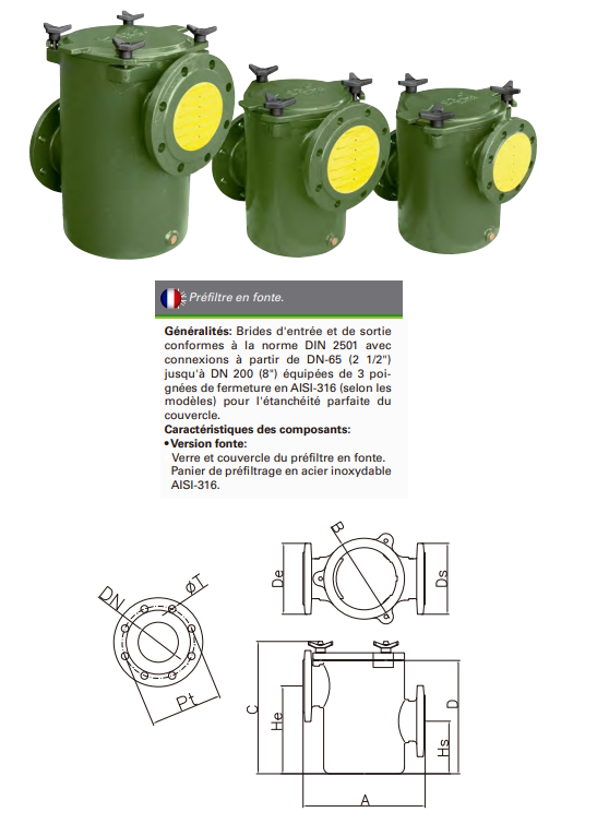 - Préfiltres en fonte avec panier et visserie de couvercle en inox AISI 316.