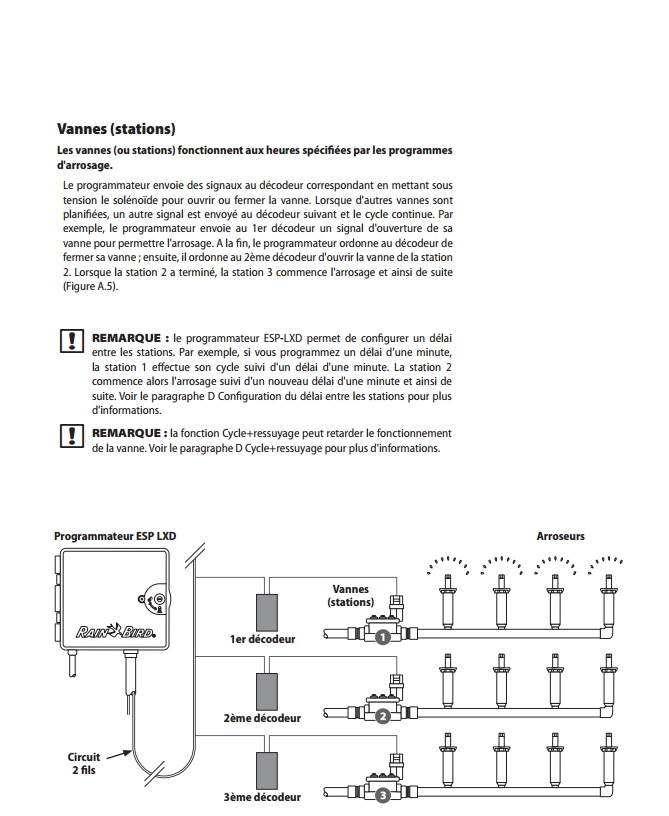 - Chaque module ESPLXD est doté de la fonction Rain Bird ‘Flow Smart’ pour la gestion du débit. Il suffit de connecter 1 à 5 décodeurs sondes et débitmètres (non inclus) au câble signal et le programmateur se charge du reste. Un large choix de fonctions de gestion du débit est disponible, y compris la fonction ‘SELF’, réglable par l’utilisateur et visant à rechercher et à éviter un faible débit ainsi que la fonction ‘SEEF’ destinée à rechercher et éviter un débit excessif. Ces fonctionnalités garantissent un fonctionnement sans soucis en cas de situation inhabituelle de débit, par exemple suite à une rupture de canalisation. - Fonction de ré-essuyage Cycle+Soak™ par station.