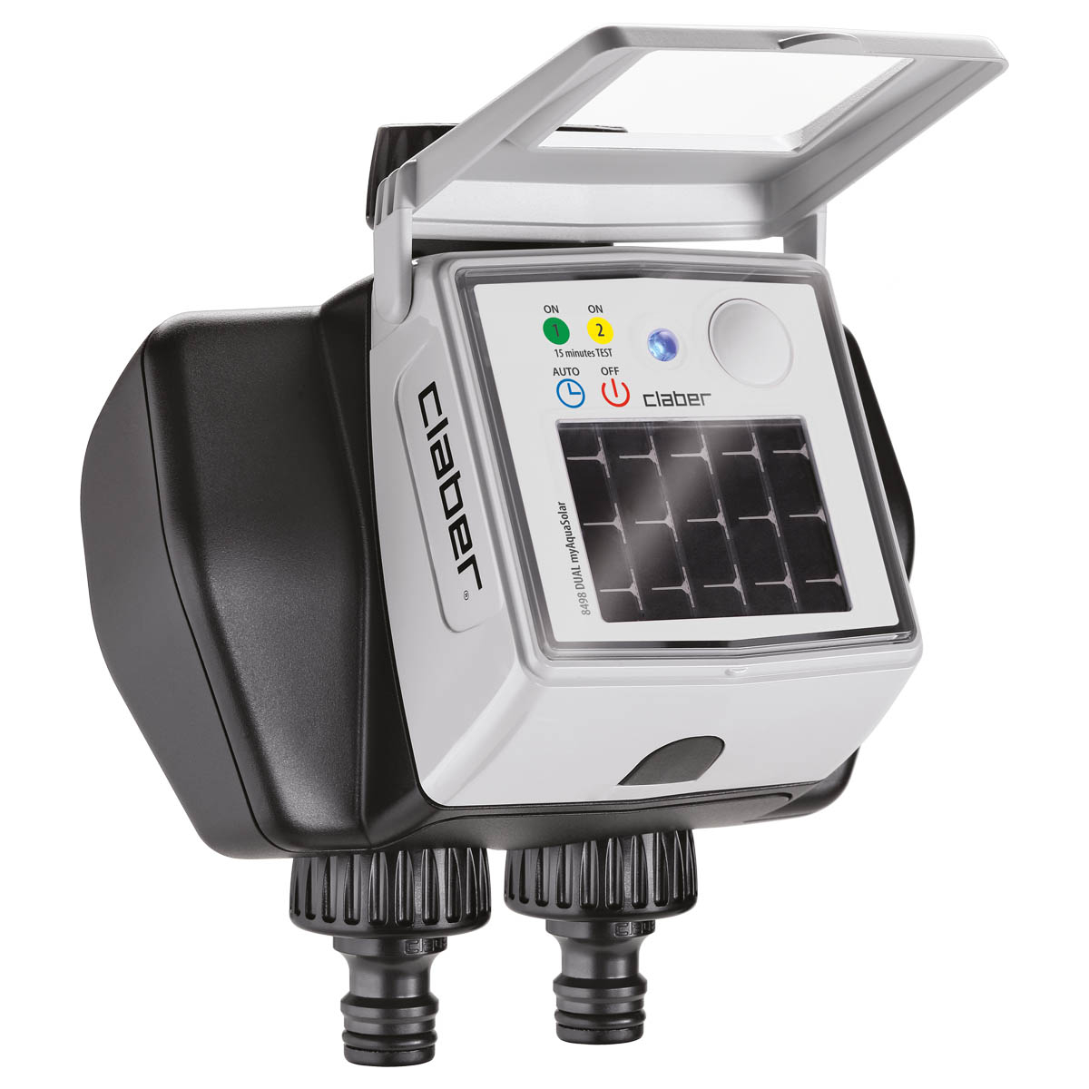 Le programmateur Dual MyAquaSolar est un programmateur automatique à deux voies avec arrosage sur des lignes indépendantes. Équipé d'un panneau photovoltaïque intégré, il fonctionne à l'énergie solaire, même sans une exposition directe aux rayons du soleil, éliminant ainsi le besoin d'utiliser des piles. Sa programmation est simple grâce à la technologie Bluetooth® et l'application Claber myAquaSolar. Vous pouvez personnaliser entièrement deux programmes par ligne et bénéficier d'une fonctionnalité de mise en marche et d'arrêt manuelle via une simple touche, également activable depuis l'application.