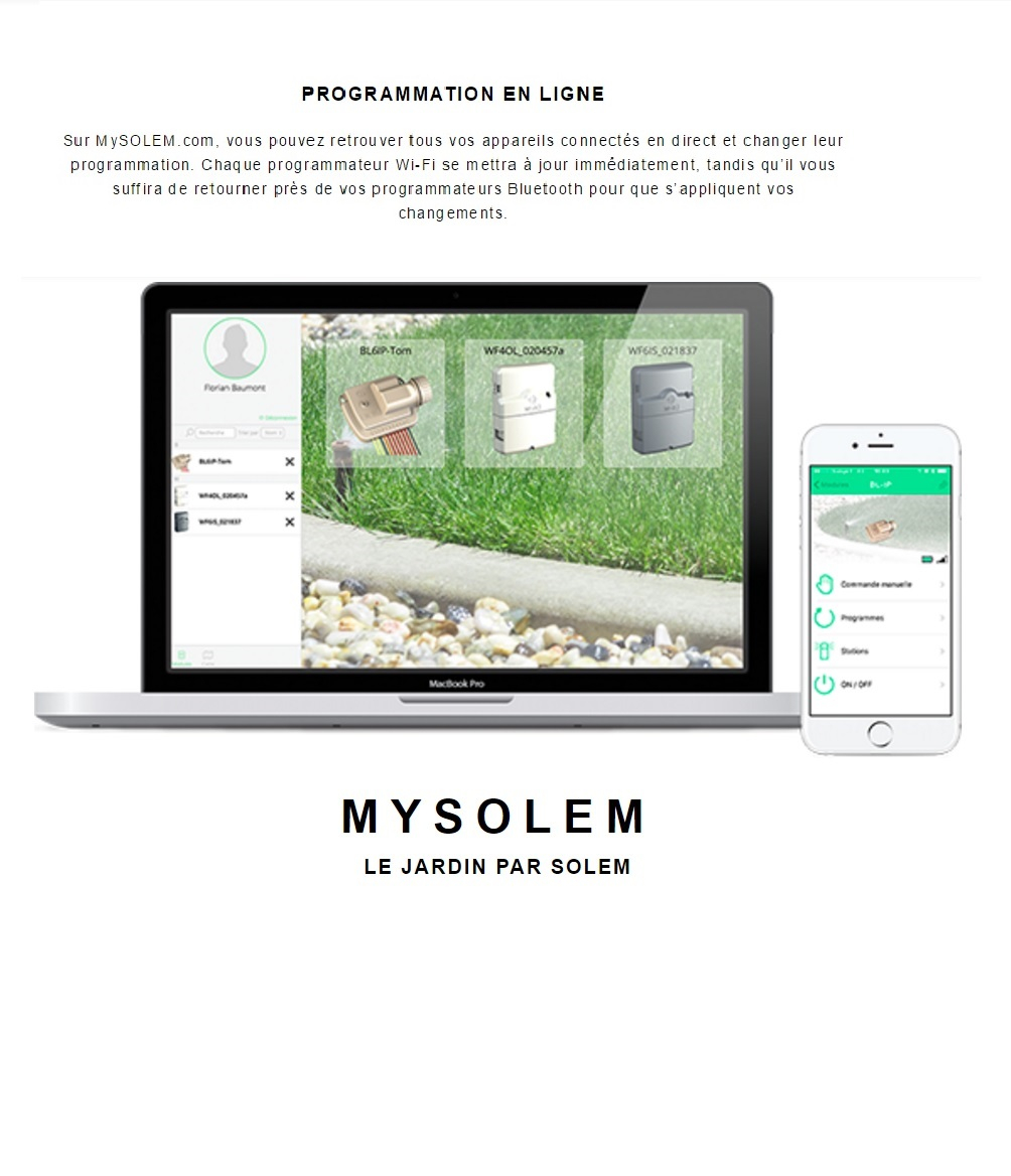 Le programmateur bluetooth BL-NR SOLEM est piloté grâce à l'application My Solem et la liaison Bluetooth Low Energy. La domotique du jardin, une vraie révolution, qui vous permet de gérer votre installation d'arrosage automatique à partir d'une tablette ou d'un smartphone. En quelques clics, votre arrosage est programmé ! L’application est disponible gratuitement sur iOS et Android.