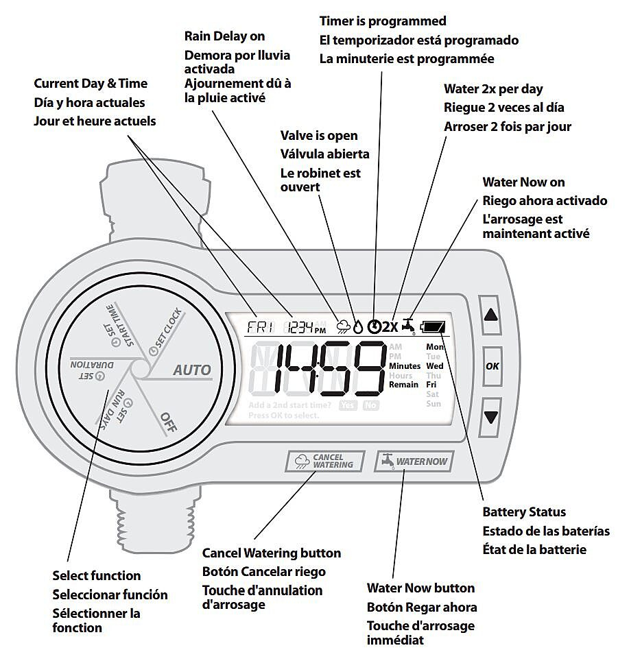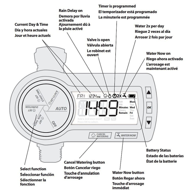 - Touches de désactivation instantanée Rain Delay pour la suspension de l’arrosage et Water Now pour l’arrosage manuel