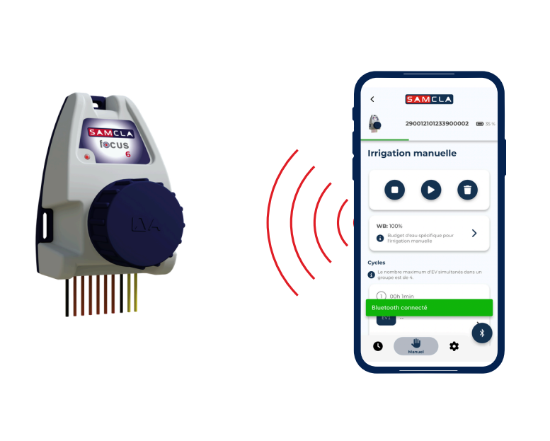 Programmateur d'arrosage SAMCLA Focus Bluetooth : 1 à 6 stations, piles longue durée, professionnel et simple.