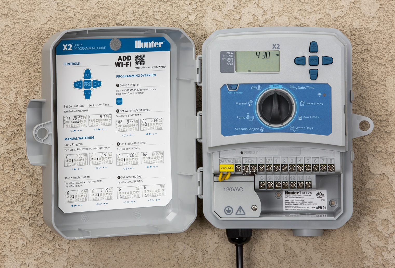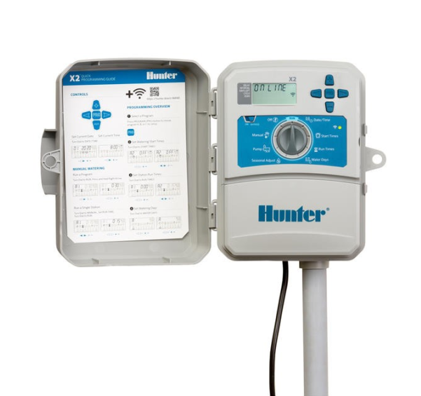 Programmateur X2 Hunter 4 à 14 stations. Fonctionne en WIFI avec le module Wand. Écran rétroéclairé. Idéal pour l'arrosage résidentiel et commercial léger.