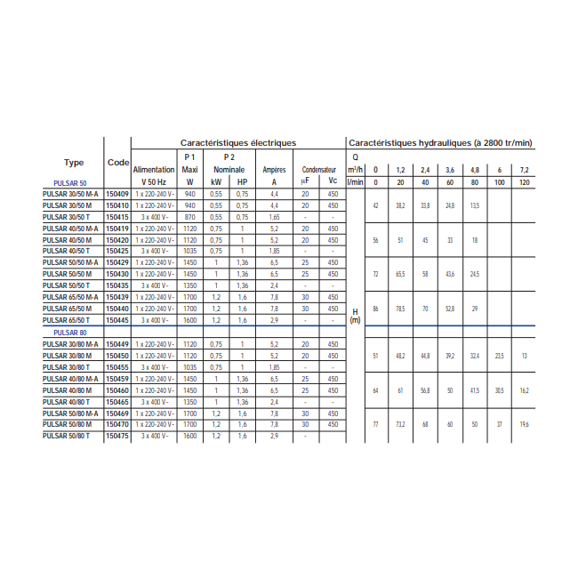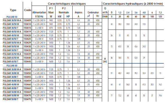 | Type de pompe immergée | Pulsar (1,2 à 7,2 m3/h) |
