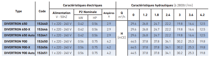 - Pompe DIVERTRON 900 : 0.75cv - 4,2A - débit jusqu'à 6,2m3/h -