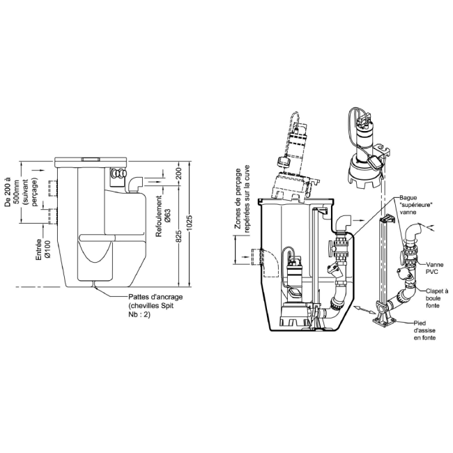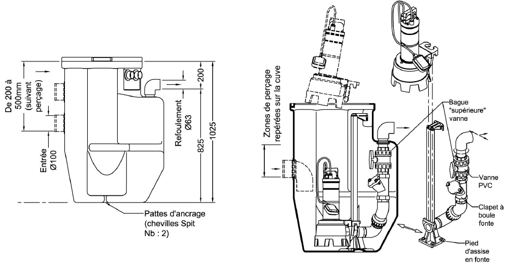 Entrée PVC 100, sortie PVC 63, ventilation PVC 50