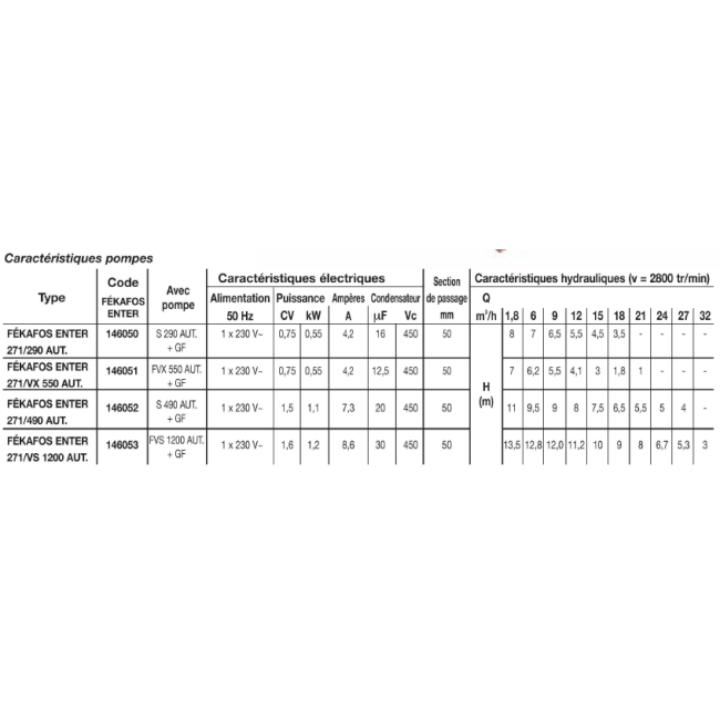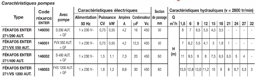 | Référence pompe de relevage | 271/290 AUT., 271/VX 550 AUT., 271/490 AUT., 271/VS 1200 AUT. |
