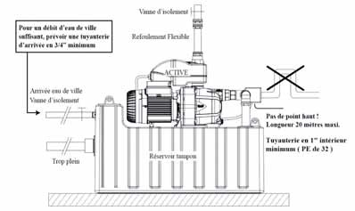 Le réservoir tampon en polyéthylène de 25 litres permet la discontinuité entre le réseau d'eau de ville et l'eau de la cuve.