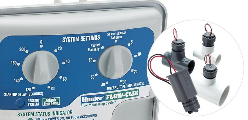 Pour cette raison Hunter a créé la sonde de débit Flow-Clik Hunter, qui protège le site en cas de rupture sur l'un de vos équipements. La sonde Flow-Clik Hunter peut être programmée au débit souhaité. Elle coupe votre système d'irrigation au moment où elle détecte un débit supérieur à la limite programmée. Cela permet donc une réduction de la quantité d'eau perdue et les dommages subis par le système, en cas de fuite extérieure importante.