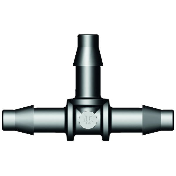 Té cannelé 4x6 utilisé pour raccorder trois tuyaux 1/4'' (4x6 mm) dans une application d'arrosage localisé.