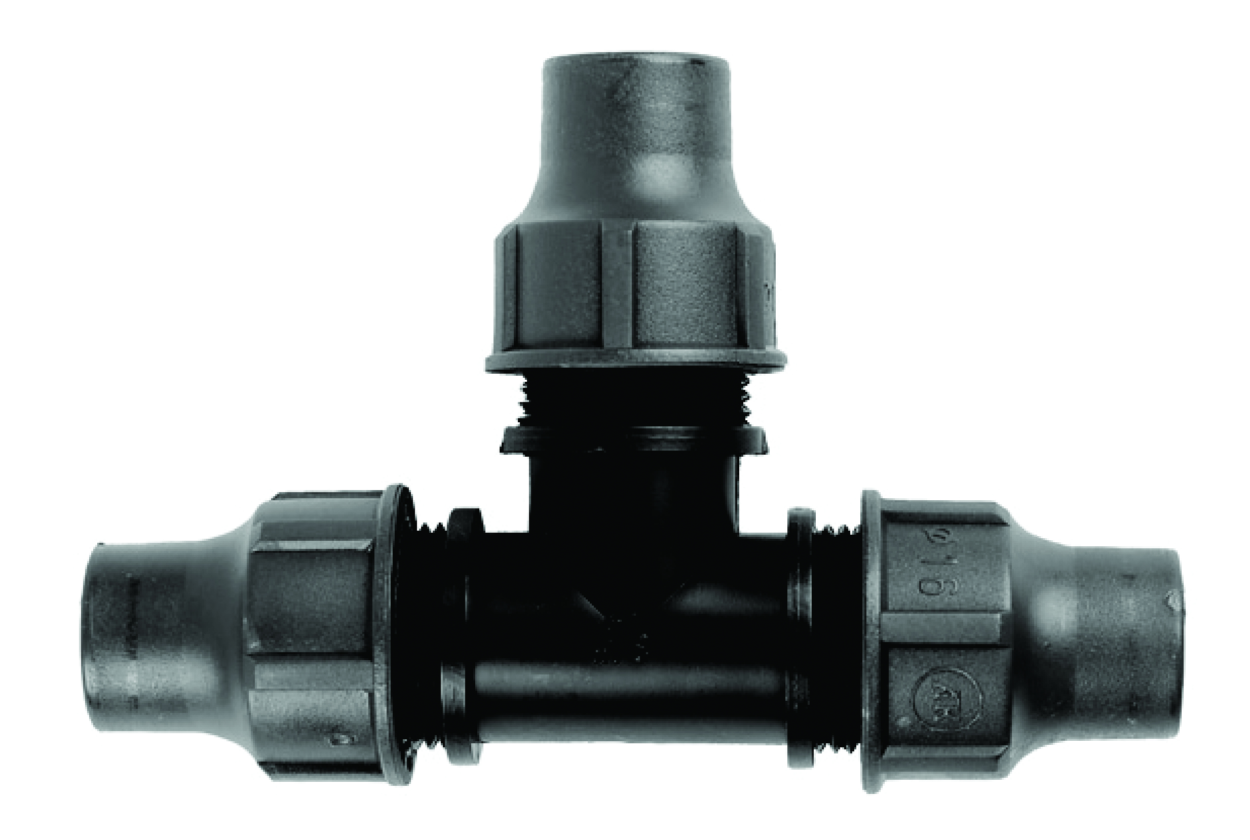 Té Palaplast 20x20x20 utilisé pour raccorder trois tuyaux et/ou dripline de Ø20mm dans une application d'arrosage localisé.