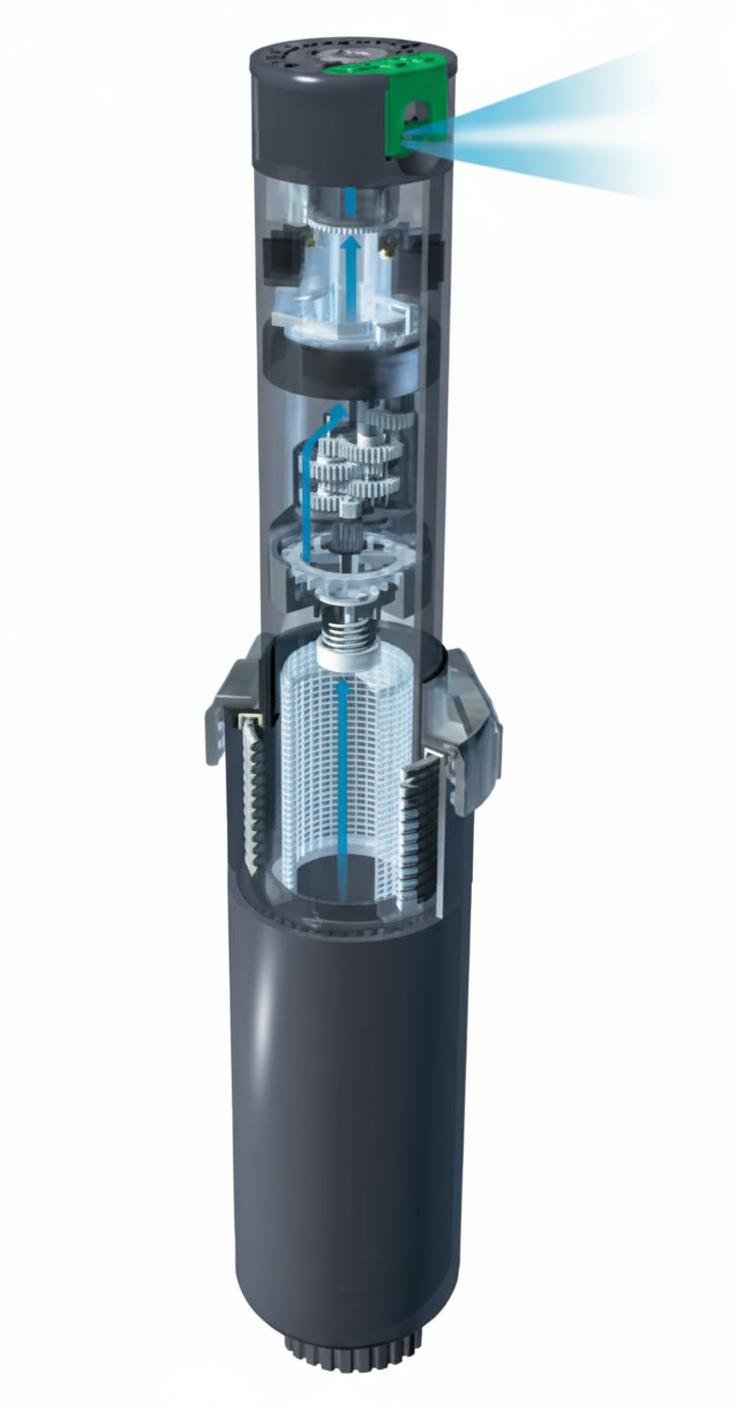 Turbine SRM à débit réduit et à faible pression qui remplace les systèmes à tuyères. Matière plastique, arc ajustable de 40 à 360°, portée de 3,5 m à 9,1 m.