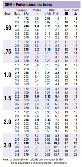 | Pluviométrie | Environ 11 mm/h à 2,8 bars pour un espacement de 4,6 à 9,1 m |