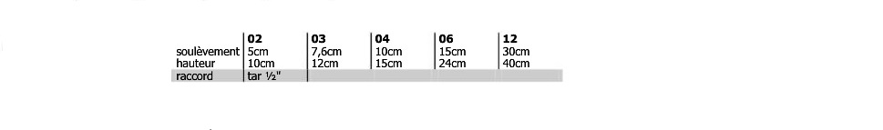 | Hauteur de soulèvement | 5,0 cm.,10,0 cm.,15,0 cm.,30,0 cm. |